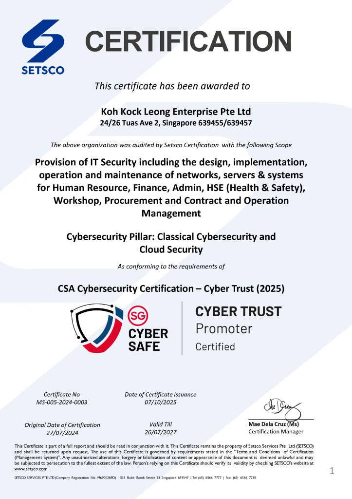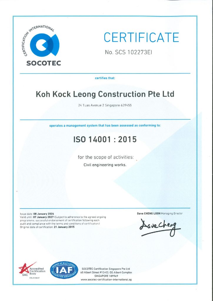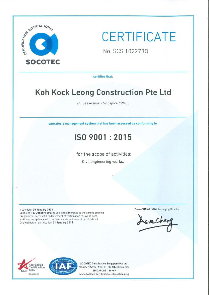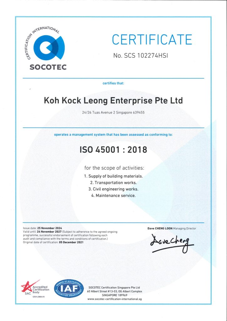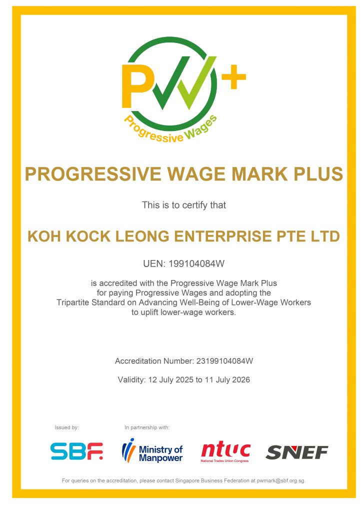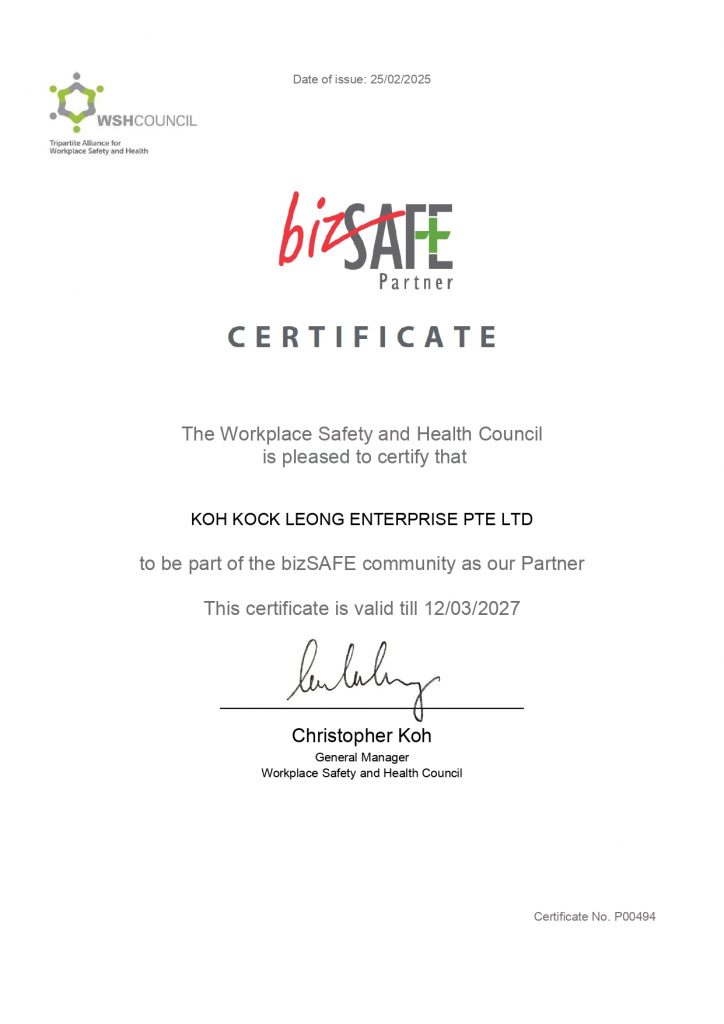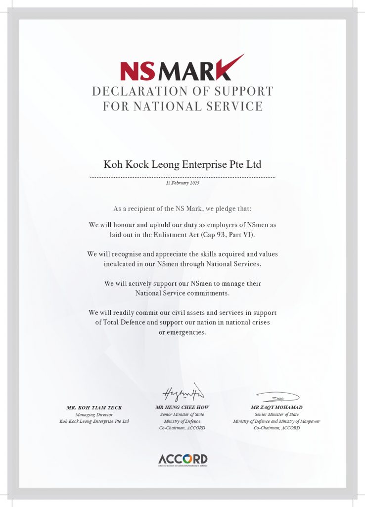 Koh Kock Leong Enterprise Pte Ltd (KKL) is thankful for our various awards & certificates. While they serve as a recognition of our contributions, they remind us to strive harder in achieving greater standards to better serve our clients, our society and our country.